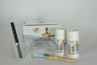 Crystal Prop est un produit bicomposant, dosage 1:1. Il est livré en 2 flacons de 100 ml. Il suffit de bien mélanger les 2 composants et d'appliquer le Crystal Prop en une seule couche au pinceau. Ce dosage permet de couvrir jusqu'à 4 hélices. Mais on pourra aussi s'en servir pour protéger l'arbre d'hélice. Laissez sécher 96 heures avant de remettre à l'eau.