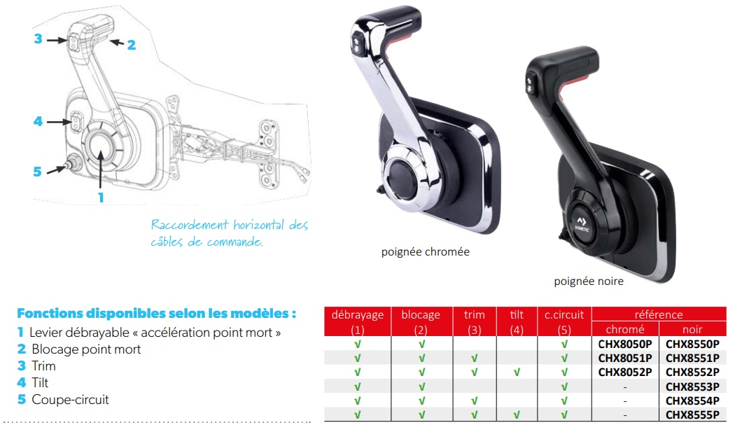 Ces boîtiers acceptent tous les modèles de câbles de commande Seastar : CC33, CCX63, CC179, CC189 et CC205. Ils sont disponibles en 3 versions (standard, trim et trim/tilt) et en deux finitions (extérieur levier chromé ou noir et avec ou sans coupe-circuit). Démarrage impossible si le levier est engagé.